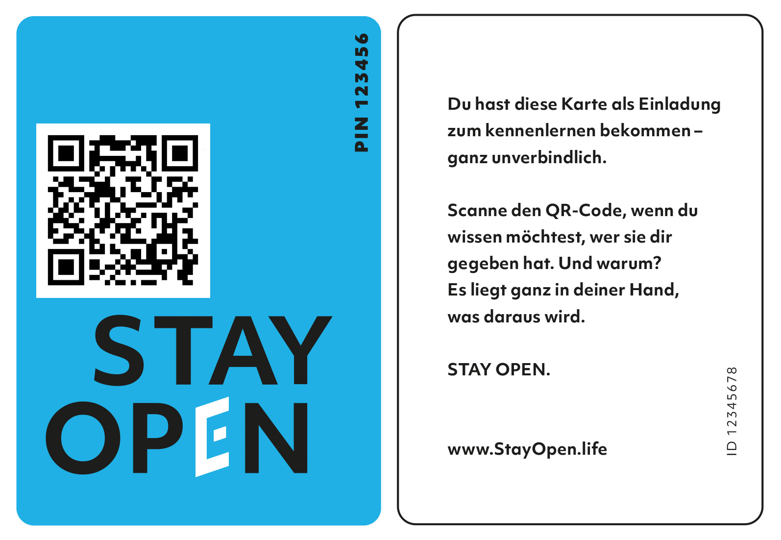 Überreiche deiner Kontaktperson einfach eine deiner STAY OPEN Karten mit jeweils individuellem QR-Code.